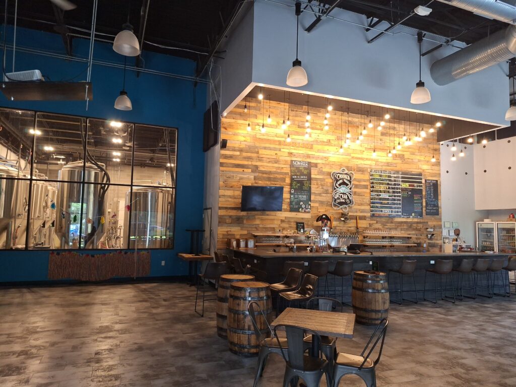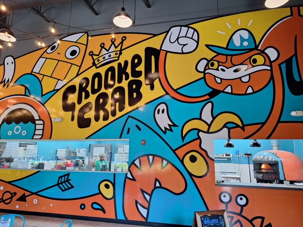 The first production brewery in Anne Arundel County, Crooked Crab was opened in February, 2018 by U-MD graduates Earl Holman, Dan Messeca, and Alex Josephs. It’s located in a prosaic business park sandwiched between two state highways in Odenton, MD. The two-story red-brick exterior is the definition on non-descript, redeemed somewhat by the brewery’s clever logo. Inside, though, customers are greeted by an expansive floor-to-ceiling mural of colorful cartoon characters that inhabit the brewery’s beer universe.