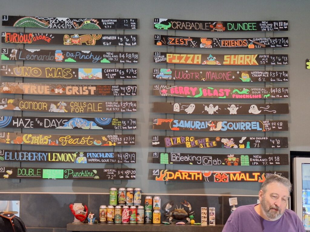 These days, however, a brewery will thrive or languish according to the quality of its hazies. One of Crooked Crab’s earliest efforts, Super Brewer Steve, won best IPA at the 2021 Maryland Craft Beer Competition. The beer ticks all the boxes for a New England-style IPA: dense haze, big juicy aroma, intense tropical and citrus flavors, hint of dankness, and pillowy mouthfeel. The brewery has been producing variations on this tasty 7% beer ever since: Fire Brewer Steve, Scuba Brewer Steve, Need for Steve, and a triple-strength version, Tanooki Brewer Steve (10.5%). The version on tap when I visited, Bizarro Brewer Steve, wasn’t bizarre so much as intensely New Zealand-like, with a pronounced white wine character mashed up against peachy sweetness and tropical notes that finished with some fresh dank. Quite tasty.