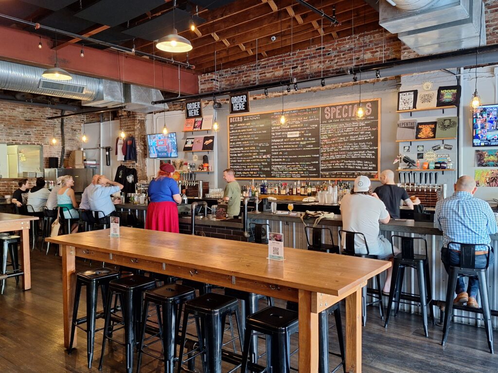 Nepenthe’s first brewer, Dan Rowe, built a solid foundation of core beers with the requisite emphasis on IPAs–but without a slavish devotion to hazies. Today 16 taps offer patrons a wide selection of mostly hoppy styles. During my June visit, there were three IPAs (one hazy, two West Coast), two DIPAs (one West Coast, one triple-strength hazy), and three easy-drinking pale ales, including one single-hopped brew. Four lager taps provide a nice range, including a Czech-style pilsner, a dry-hopped pils, a rice and tea-flavored lager, and a light lager. Customers seeking a maltier flavor could choose from a red ale, an ESB, and a strong Baltic porter. Sours are a low priority: the only one on the menu–a blend of blackberries, raspberries, and blueberries—was mediocre at best. Still the 16-tap line-up is broad enough to offer something for every beer drinker’s taste. And while I didn’t see much innovation or experimentation on the menu, every beer I tasted was solid AF.