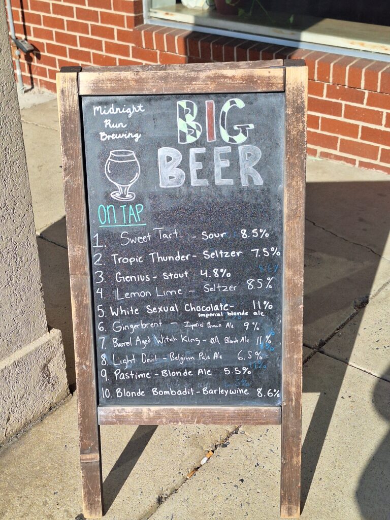 “Big Beer” boasts a chalkboard outside the entrance to Midnight Run Brewing. Underneath that heading, 10 beers currently on tap are listed. Their average ABV was 7.9% the afternoon I stopped by; a majority were 8.5% or higher. Those numbers might come as a shock to longtime patrons. When the Frederick brewery first opened, the majority of beers on tap were 10% or higher.